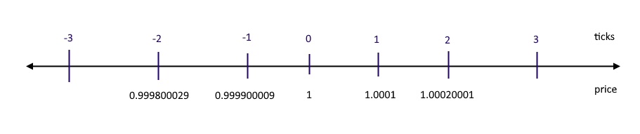 The ticks are distributed logarithmically: the tick with index i corresponds to the price: