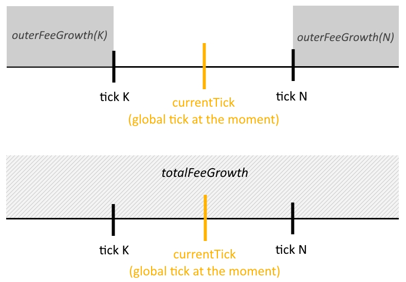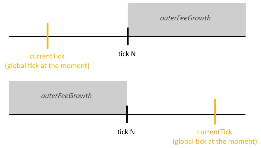 Two additional values are stored in each tick that correspond to the accumulator increments "outside" the ticks: outerFeeGrowth0Token, outerFeeGrowth1Token.